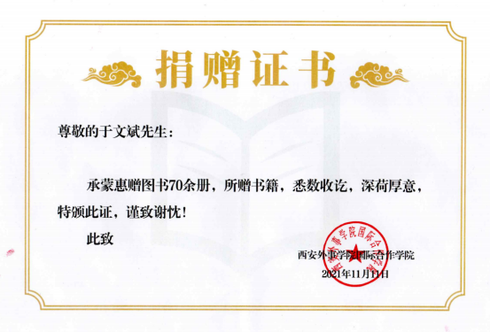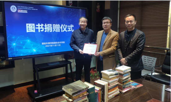 于文斌教授现为企业退休职工,曾长期在省外办、高校等单位工作,积累了大量外语类书籍。退休后一直关心关注高校工作尤其是外语学科的发展,他希望所赠书籍能为公司师生所用,并表示后期将陆续整理并捐赠其他语种的书籍,为公司外语学科发展尽一份力量。