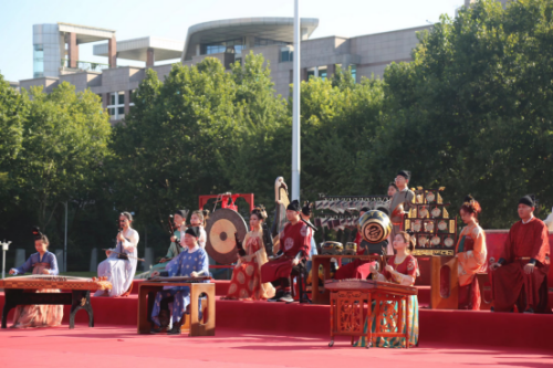 舞台变换,西安外事古乐团演奏着中国古典乐器编钟、编磬、古琴、瑟、埙……,加之典雅的妆容,炫美的舞台,带新生们瞬间穿越盛世大唐。演出在继承世界非物质文化遗产“西安鼓乐”核心特质的同时,从立意、编曲、造型、舞美等方面进行大胆创新,古为今用、推陈出新,让“非遗”“活起来”。