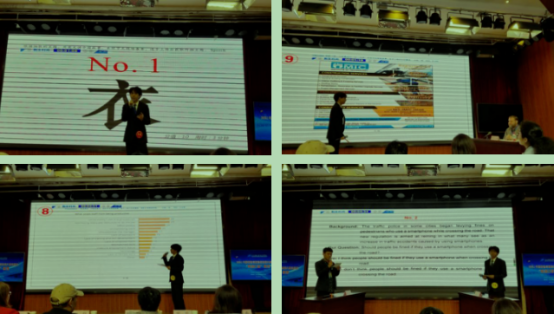 比赛分为四个环节:中国故事、情景交流、职场描述和职场辩论。半决赛中,在与外籍评委John Arrant三分钟的职场“情景交流”及“中国故事”——基于传统服饰的主题演讲环节中,翟毅同学表现优异,高分通过。“职场描述”环节,参赛选手现场抽取一幅反映行业、企业业务发展或社会、经济等热点问题的统计图表,进行限时3分钟的描述。五分钟的“职场辩论”中,两名参赛选手则根据抽签结果分正、反两方,就一道职业领域或社会热点辩题展开现场一对一辩论。