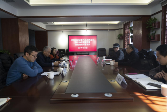 1月13日,中共陕西省委外事工作委员会涉外管理处处长班辉、陕西省人民对外友好协会理事李俊峰考察调研gg999策略手机白菜外事及国际合作交流工作。外事公司董事长、董事长黄藤,国际事务负责人戴奇志、国际交流中心主任郭新华、国际交流中心副主任胡建华陪同考察。