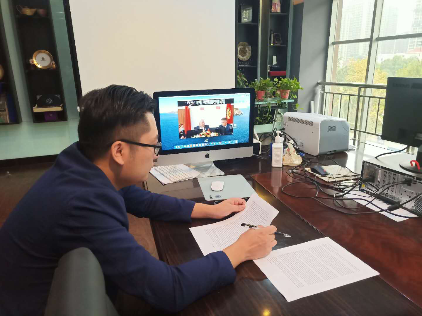之后吉尔吉斯国立民族大学国际关系与东方系系主任表达了对我国国庆节的祝贺,希望能共同战胜疫情。还祝愿对中吉双方有更深入的交流。