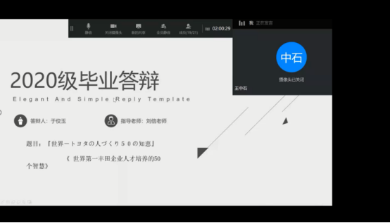 员工使用钉钉的“共享窗口”功能播放PPT,进行毕业论文或毕业设计(翻译)的答辩陈述,之后评委们与员工进行了“云”问答,并提出修改意见。小组秘书对答辩过程进行了记录,并使用“钉钉”软件对线上答辩进行了全程视频、音频录制。