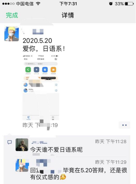 此次既新鲜又紧张的网络答辩碰巧遇上了2020520,答辩结束后员工们纷纷发朋友圈对日语系进行了表白。