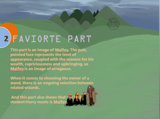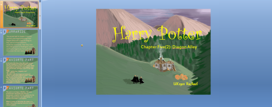 Cecilia: Rachael did a brilliant job. First of all, the PowerPoint is well-made, with appealing template used and attractive background music. Audience can enjoy themselves in the graphic, which is especially nice because of its strokes and texture, like an oil-painting. Secondly, the summary is accurate, and her favorite part is also mine, which is very impressive in this novel. Finally, the interaction section is well designed, each with a clear and specific answer. Although problem arises in the delivery of speech, overall it is a good model for the rest of the class.