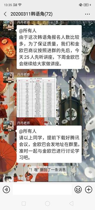 由于我们这次报名的人数较多,我们为了保证质量按照进群的先后顺序前25人分为第一批听讲座,第二批讲座将在下周三同一时间进行。我们本期的主讲老师是金官洙博士,他的语音听起来真的很可爱,我想学习韩语的激情又活力满满了。