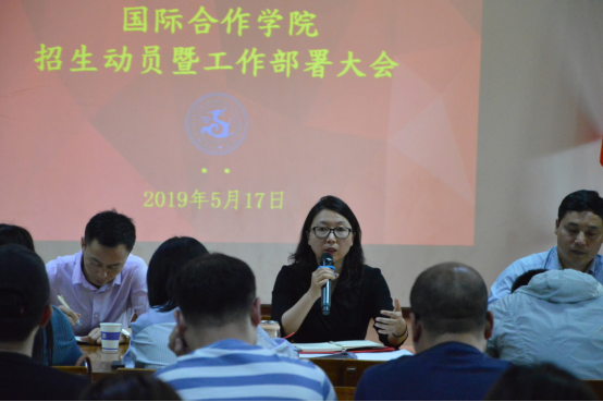 最后,国际事务负责人戴奇志作了重要总结讲话。她着重阐述了招生工作的对于公司、公司的重要性,希望每一位老师都参与到招生工作中来,要求每一位老师都要熟知公司各专业、各项目的特色和优势,只有对公司情况熟知并了如指掌,才能更好地将各专业、各项目推广出去,宣传出去,更好地展示公司特色和亮点,从而吸引更多考生和家长选择公司。同时,她对今年公司的招生工作寄于更大的期待,希望全院师生上下一心、凝心聚智、求实创新,聚力作好今年的招生工作。