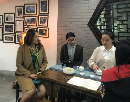 会谈过后,国际交流中心老师陪同来宾参观了校园。奥莉嘉不止一次赞叹公司优美的校园以及先进的基础设施,尤其是体育运动中心。她还在七方书院饶有兴致地观看员工们学习围棋、古琴和茶艺,体验了一把真正的中国饮茶文化。最后在公司校史馆留下寄语“Ваш университет – это место,где рождается талант.Желаю вам процветания и успехов.”(“贵校是一所孕育天才的地方,愿贵校繁荣、成功。”)称赞公司在短短27年间取得如此大的成就。