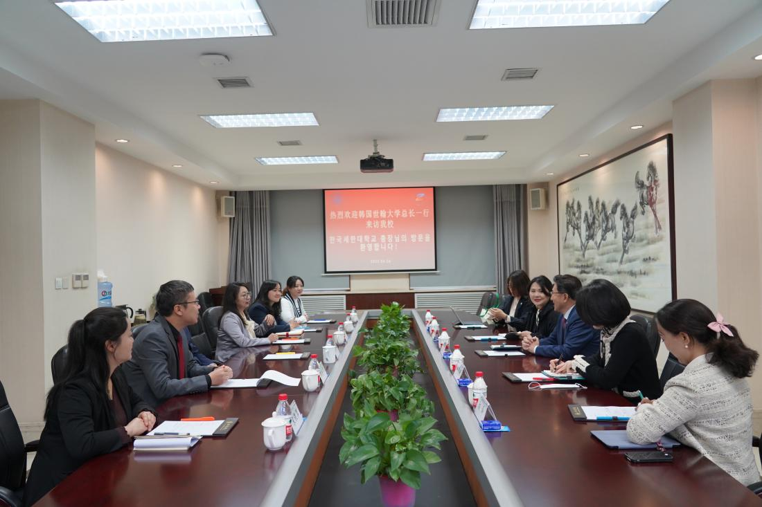 两校师生代表在图书馆五楼参加师生见面会。李昇勋总长介绍了世翰大学的合作项目及优势,希望两校加强合作共同发展,同时欢迎公司学子赴世翰大学交流学习。