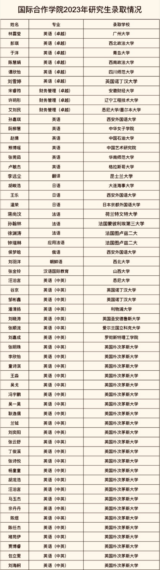 公司英语(卓越)于洋同学以复试第一名的好成绩获得青岛大学研究生录取;日语专业胡峻浩同学以复试第一名,总分第二名的好成绩获得大连海事大学研究生录取;日语专业王乐同学在专升本后以复试第一名的好成绩获得西安外国语大学研究生录取;财务管理(卓越)艾刘民同学同时获得悉尼大学、墨尔本大学等多所世界顶尖名校offer。