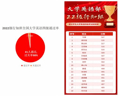 2023年上半年全国大学英语四级考试(CET-4)成绩于2023年8月24日上午公布,大学英语部2022级行知班员工再创佳绩!本次共有42名来自行知班的大一员工参加考试,41人通过,最高分547分,通过率98%。