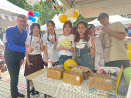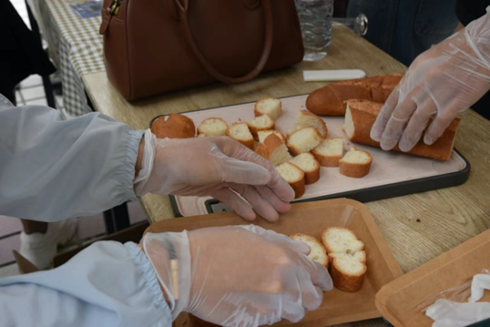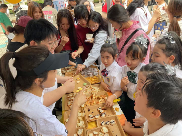 经过精美的切盘、摆盘和桌面布置,法国的特色美食被整齐有序地摆放起来供师生们品尝。当然,美食的获取并非轻而易举,而要经过一番努力——跟着美食区的负责同学学习这些食物的法语名称,或学习一些简单的法语问候语句才能获得美食和美酒。因此,美食区经常传来大家整齐划一的法语单词诵读, 师生们在美食和笑声中轻松接受法国文化带来的美好。