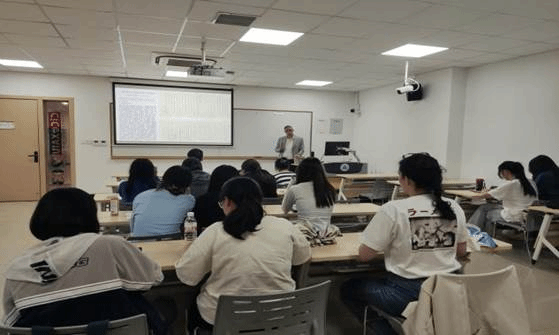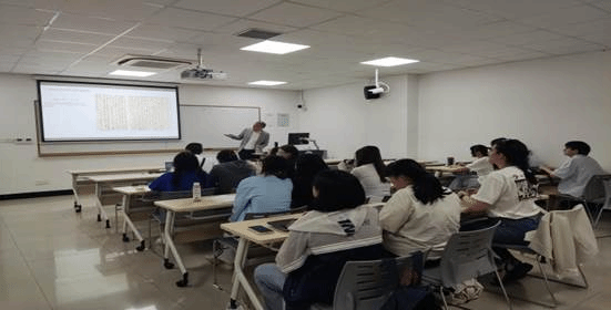 讲座伊始,西班牙语系外教贝白老师用中西英三种语言幽默风趣的向大家介绍了此次讲座的主要目的和内容。紧接着,外教老师David开始讲解唐诗的外语翻译技巧。他提到:文本有两种类型:原本和复印本,因为现在的很多文学著作都是复印本,原稿十分珍贵。他带领同学们学习和浏览了乾隆皇帝的《泥金书四得续论》、《孙子兵法》、《道德经》等文学著作,同学们受益匪浅,再一次深深的被古代文学深厚底蕴所折服。