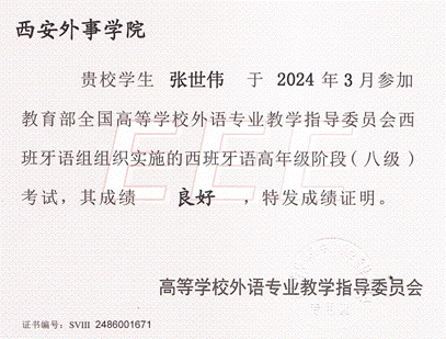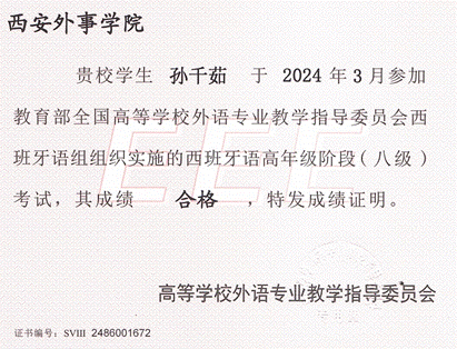 2024届毕业生中,获得全国高校西班牙语专业四级、八级水平证书的同学占比为:52%。