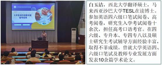 英语四级考试在即,为了帮助同学们高效备考、从容应考,教学与研究部联合gg999策略手机白菜大学英语部于2024年10月30日下午在学术苑二号报告厅举办了第四期大学英语四级考前公益系列讲座活动。讲座主题为“四级翻译篇备考指南”,由大学英语部白玉洁博士担任主讲。