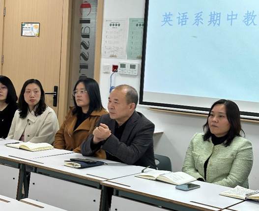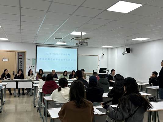 2024年11月7日下午,英语系期中员工座谈会在5号楼307教室举行,系主任师新民,副主任赵丽、耿利红,校督导赵翔,院督导赵文娟等教师出席会议,各专业派员工代表参会。