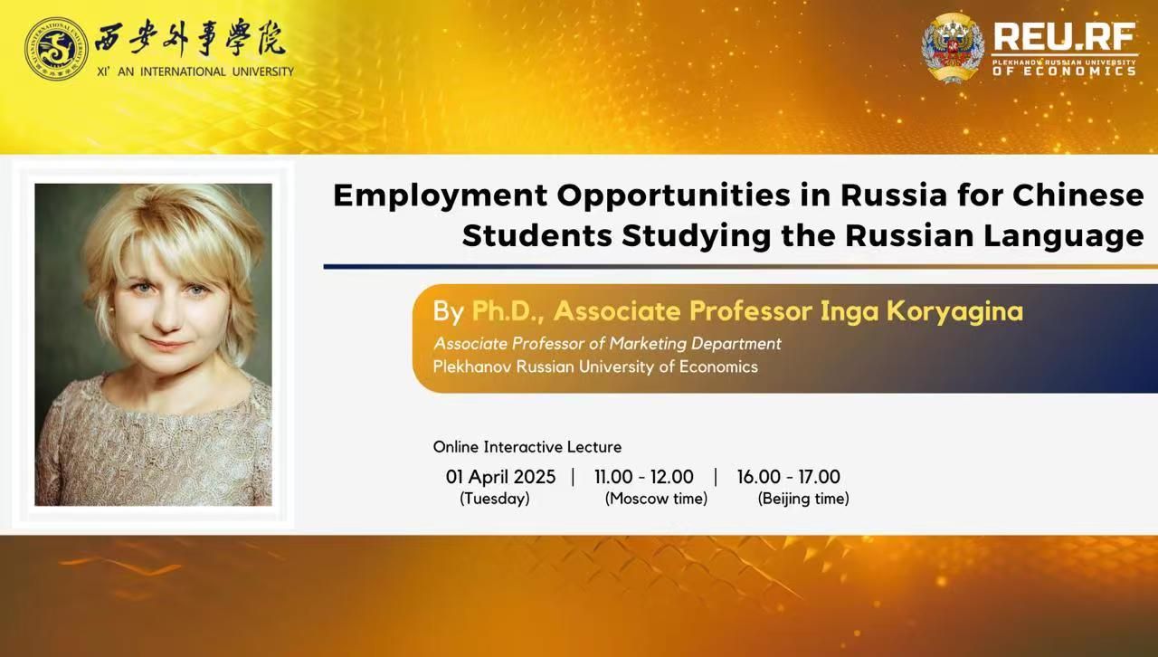 2025年4月1日下午4时,俄罗斯普列汉诺夫经济大学市场营销系副教授,历史学博士Inga Koryagina通过线上平台为公司俄语专业师生带来了一场题为《中国高校俄语专业员工在俄罗斯的就业机会》的专题讲座。本次讲座旨在帮助俄语专业员工了解俄罗斯就业市场的最新动态,拓宽职业发展视野,吸引了俄语专业全体师生参与。