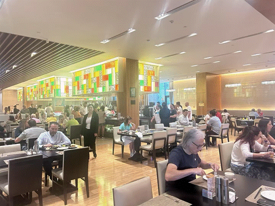 在后续的水吧、晚宴等活动中,三位同学全程坚守翻译岗位。水吧活动时,她们穿梭于宾客之间,及时为客人介绍饮品特色,解答疑问,营造轻松愉悦的交流氛围。晚宴上,面对正式的场合和复杂的交流内容,她们始终保持专注,无论是贵宾之间的商务交谈,还是对活动安排的讨论,都能迅速、准确地完成翻译工作,确保信息的精准传递。此外,她们还积极与酒店餐饮、客房、礼宾等部门保持密切沟通协作。每天活动结束后,都会主动收集客人的需求和意见,整理成详细的报告反馈给各部门。例如,针对客人提出的希望增加西班牙特色早餐的建议,她们及时与餐饮部沟通协调,第二天早餐时段便为客人提供了西班牙油条蘸热巧克力、伊比利亚火腿等特色美食,让贵宾感受到贴心的个性化服务。