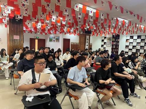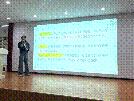 随后,韩正颖老师着重强调了同学们在论文撰写过程中应具备的责任意识和主动性,要求大家积极完成各阶段的任务。她提到,日语专业2026届毕业设计可以从撰写毕业论文和翻译实践报告两种形式中进行选择。之后,她对毕业论文的进度安排和任务内容进行了更为细致的讲解,明确指出同学们需要在规定的时间节点,在老师的指导下依次完成开题报告、中期检查、论文提交、学术不端检测、盲审以及答辩等一系列环节,并提醒同学们在遇到问题时要及时与老师沟通。在此基础上,韩老师还详细阐述了选题要求以及毕业论文系统的操作流程。同学们全神贯注地聆听,并认真做好了记录。韩老师提到,日语专业本科生的选题范围可以围绕日语语言学、日本文学、文化等相关领域展开。经过韩老师耐心细致地讲解,同学们表示收获颇丰。