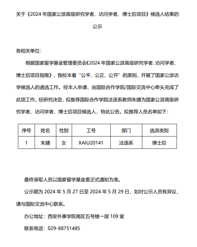关于《2024年国家公派高级研究学者、访问学者、博士后项目》候选人结果的公示